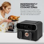 ۴) مناطق پخت و پز با کنترل مستقل: درجه حرارت در سبدها را می توان به صورت جداگانه کنترل کرد و دارای نمایشگر دما و زمان سبد چپ و راست با پایان همگام سازی و گزینه های پخت دوگانه باشد. همچنین دارای یادآور لرزش در زمان پخت است.
