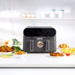 می توانید غذاهای سالم و خوشمزه بدون روغن تهیه کنید. این سرخ کن بادی از مواد مرغوب ساخته شده است و به گونه ای طراحی و ساخته شده است که پخت و پز روزانه را آسان می کند. سرخ کن دیجیتال ۱۱ لیتری که می توان آن را به دو سبد ۵.۵ لیتری با جداکننده تقسیم کرد، از نظر ظاهر و کارایی رتبه بالایی دارد. برای تهیه غذای کاملا سرخ شده، سالم و کم چرب بدون روغن برای کل خانواده ایده آل است. سرخ کن هوا از فناوری سرخ کردن هوای VORTEX استفاده می کند که با ۹۹ درصد روغن کمتر ۳۰ درصد سریعتر پخته می شود و از چرب نبودن غذا اطمینان حاصل می کند. این به شما کمک می کند تا غذاهای خوشمزه ای را تهیه کنید که از بیرون ترد و از داخل لطیف هستند و بدون روغن اضافه شده اند. سرخ کن دارای یک صفحه نمایش LED با درجه حرارت در سبدها است که می توان آن را به صورت جداگانه کنترل کرد و دارای نمایشگر دما و زمان سبد چپ و راست با پایان همگام سازی و گزینه های پخت دوگانه است. همچنین دارای یک یادآوری لرزش برای زمان اواسط پخت و برنامه های پخت از پیش تعیین شده است که به شما امکان می دهد تایمر را از ۱ تا ۶۰ دقیقه تنظیم کنید. پایان همگامسازی زمانهای پخت را در سبدها کنترل میکند تا همزمان پخت و پز را تمام کنند. علاوه بر این، دارای محدوده ترموستات قابل تنظیم مداوم بین ۸۰ تا ۲۰۰ درجه سانتیگراد است. برنامه های از پیش تعیین شده شامل برشته کردن، آبگیری، گرم نگه داشتن و غیره است. می توانید مواد غذایی مختلفی از جمله سیب زمینی سرخ شده، مرغ، سوسیس، کیک، نان، کیک و … را در آن بپزید. سرخ کن هوا بسیار بادوام و مقاوم در برابر خوردگی است و می تواند سال ها به خوبی به شما خدمت کند. سبد کاملاً از مرغوب ترین مواد ساخته شده است، روی غذا ملایم است، پوسته پوسته نمی شود و بهداشتی و برای استفاده بی خطر است. چرب نمی شود، بنابراین می توانید غذای سرخ شده خود را به راحتی بیرون بیاورید. ساختار قوی و مستحکم، پخت و پز بی دردسر را فراهم می کند. تمیز کردن و نگهداری سرخ کن هوا نیز آسان است. طراحی ساده، رنگ خاکستری متالیک و ویژگی های کاربردی آن را به گزینه ای ایده آل برای آشپزخانه شما تبدیل کرده است و همچنین گزینه ای عالی برای هدیه دادن است. سرخ کن بادی دیجیتال Geepas دارای ۲ سال گارانتی می باشد.