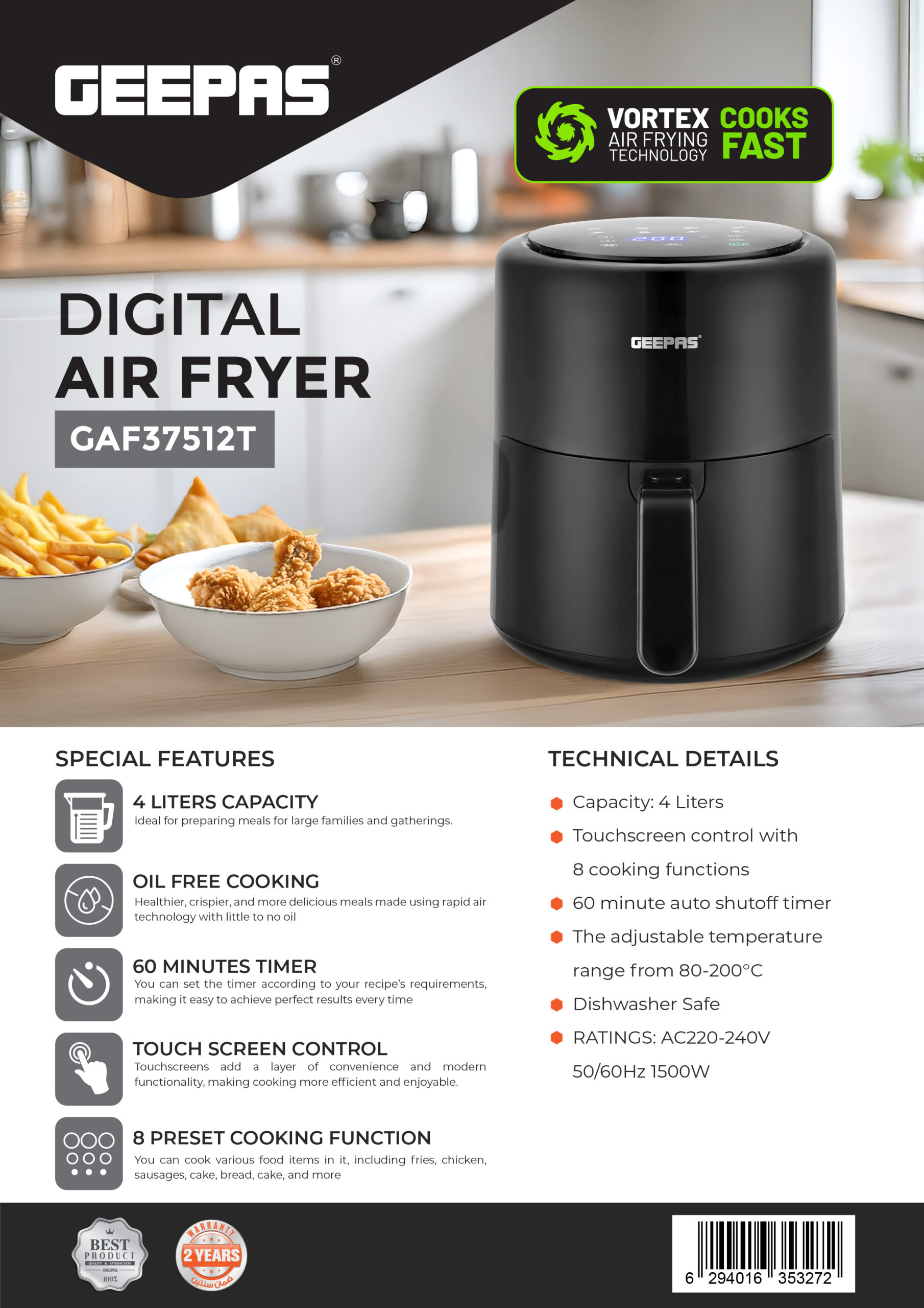 مشخصات فنی ظرفیت: ۴ لیتر ○ کنترل لمسی با ۸ عملکرد پخت ○ تایمر خاموش شدن خودکار ۶۰ دقیقهای ○ محدوده دمای قابل تنظیم از ۸۰ تا ۲۰۰ درجه سانتیگراد ○ قابل شستشو در ماشین ظرفشویی ○ توان مصرفی: AC220-240V 50/60Hz 1500W