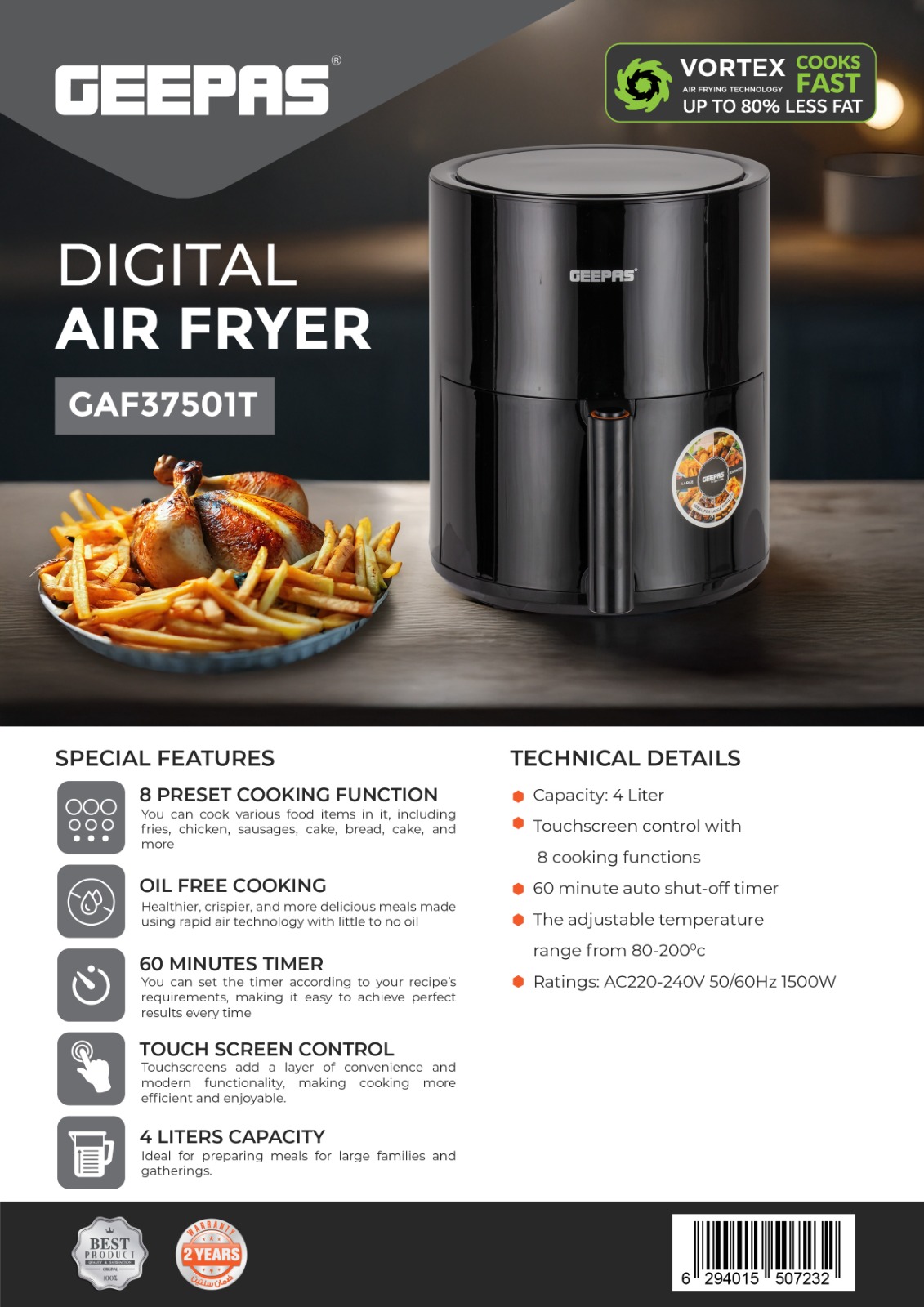 مشخصات فنی • ظرفیت: ۴ لیتر ○ کنترل لمسی با ۸ عملکرد پخت و پز و تایمر خاموش شدن خودکار ۶۰ دقیقهای ○ محدوده دمای قابل تنظیم از ۸۰ تا ۲۰۰ درجه سانتیگراد ○ توان مصرفی: AC220-240V 50/60Hz 1500W