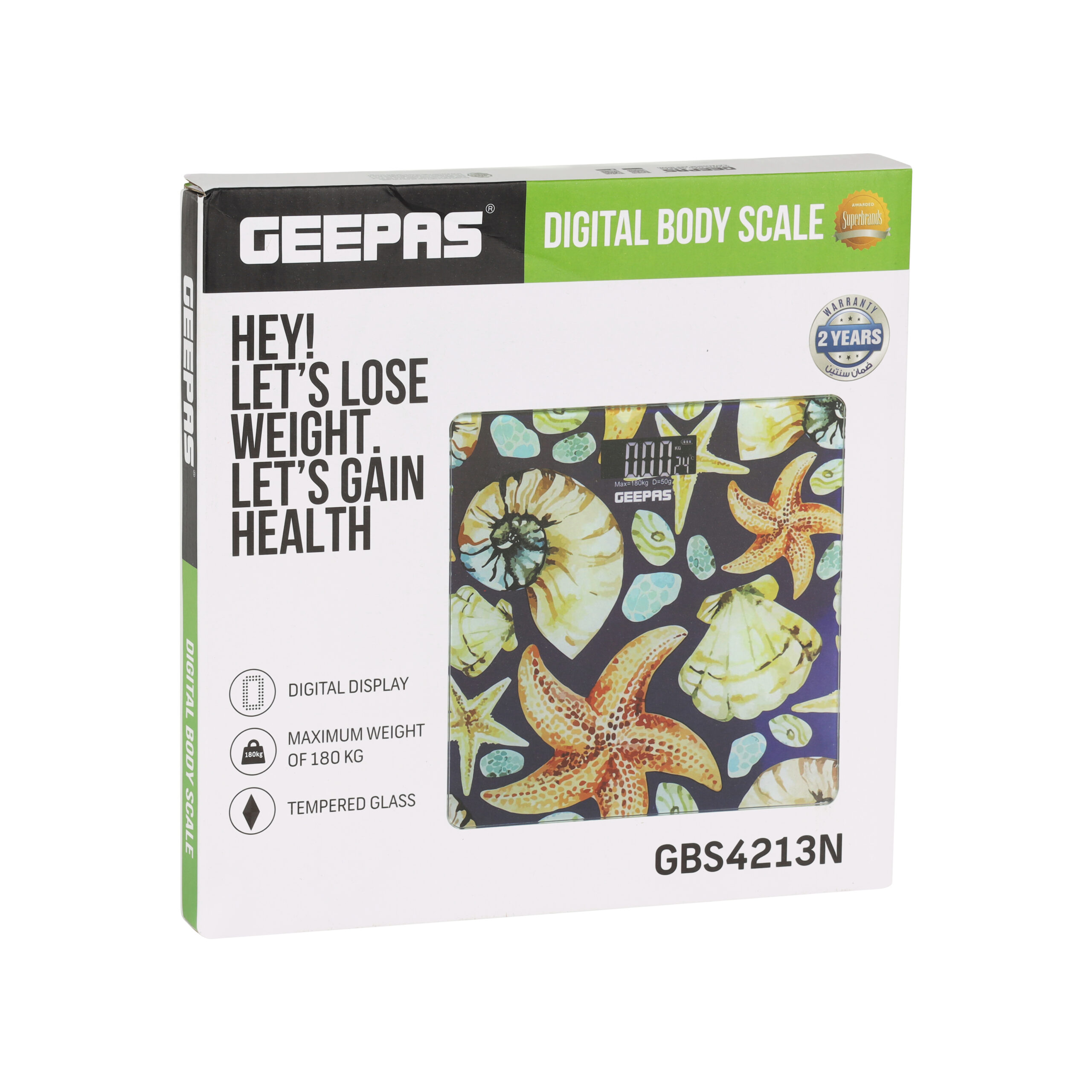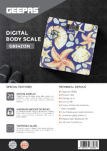 مشخصات فنی • ظرفیت: ۱۸۰ کیلوگرم ◦ تقسیم‌بندی: ۵۰ گرم ○ واحد: کیلوگرم، پوند، استاندارد ○ روشن/خاموش شدن خودکار ○ منبع تغذیه: ۲ عدد باتری ۱.۵ ولتی AAA (شامل نمی‌شود) ○ نشانگر باتری کم/بار اضافی ◦ صفحه نمایش از جنس شیشه سکوریت ○ اندازه محصول: ۳۰x۳۰x۲.۵ سانتی‌متر ○ اندازه صفحه نمایش: ۷.۲x۲.۸۰ سانتی‌متر.GBS4213N