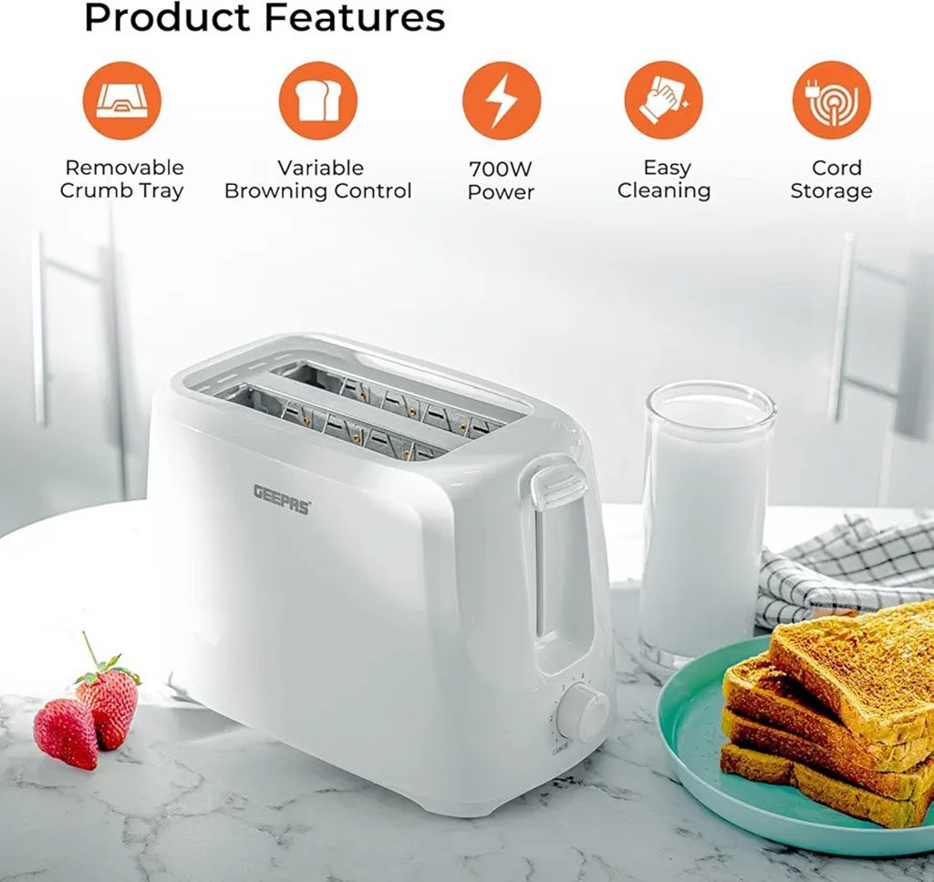 توستر ۷۰۰ وات ۲برش | بدنه پلاستیکی مقاوم در برابر حرارت | ۶ درجه تنظیمات توست کردن | عملکرد لغو | دارای سینی خرده نان و ذخیره سازی سیم