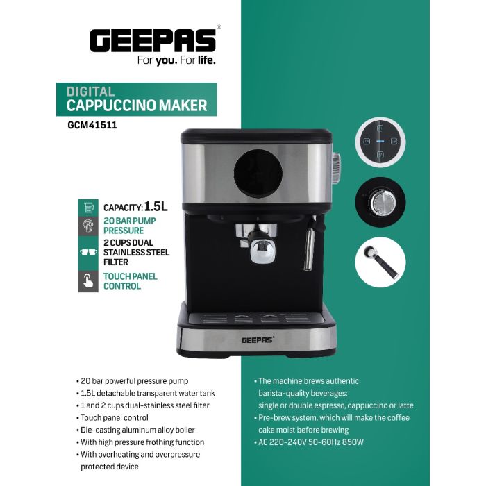 فشار پمپ 20 بار ظرفیت 1.5 لیتر 2 فنجان فیلتر فولاد ضد زنگ دوگانه کنترل پنل لمسی| GCM41511