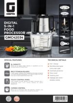 ○ طراحی ۵ در ۱ ○ چرخ‌دنده و تیغه برش از جنس استیل ضد زنگ ◦ محافظ گرمای بیش از حد ○ کاسه شیشه‌ای ○ دریچه تغذیه • توان نامی: ۲۲۰-۲۴۰ ولت ~ ۵۰/۶۰ هرتز ۵۰۰ وات| GMC42034
