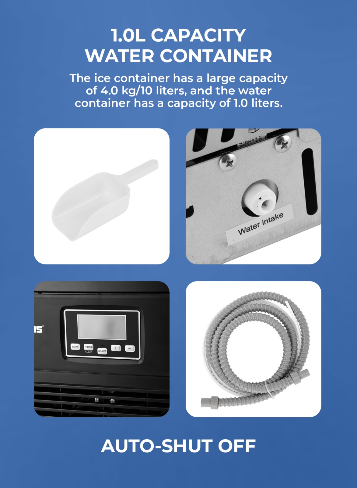 • ظرفیت ظرف یخ: ۴.۰ کیلوگرم/۱۰ لیتر • ظرفیت ظرف آب: ۱ لیتر