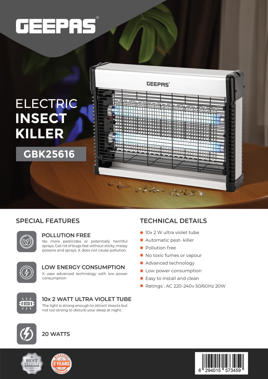 ویژگیهای خاص بدون آلودگی دیگر نیازی به آفتکشها یا اسپریهای بالقوه مضر نیست. بدون سموم و اسپریهای چسبنده و کثیفکننده، به سرعت از شر حشرات خلاص شوید. باعث آلودگی نمیشود. مصرف انرژی کم از فناوری پیشرفته با مصرف برق کم استفاده میکند ۱۰ عدد لامپ فرابنفش ۲ واتی نور به اندازه کافی قوی است که حشرات را جذب کند اما آنقدر قوی نیست که خواب شبانه شما را مختل کند. ۲۰ وات