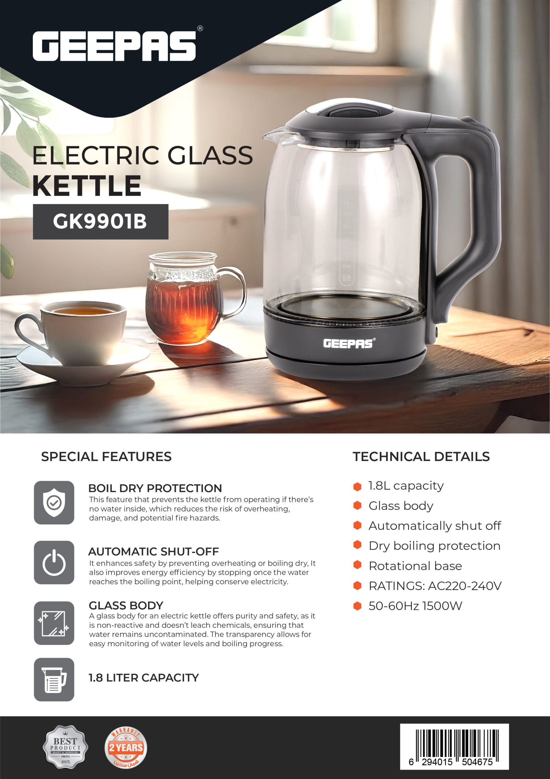 • ظرفیت ۱.۸ لیتر + بدنه شیشهای • خاموش شدن خودکار • محافظت در برابر جوشیدن آب • پایه چرخشی • توان مصرفی: AC220-240V 50-60Hz 1500W
