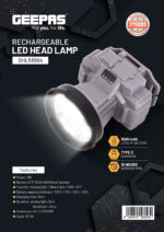 • باتری: باتری لیتیومی ۳.۷ ولت ۱۵۰۰ میلی‌آمپر ساعت ◦ عملکرد: نور قوی/نور ضعیف/SOS/خاموش – نشانگر ظرفیت باتری: ۱۰۰٪/۷۵٪/۵۰٪/۲۵٪