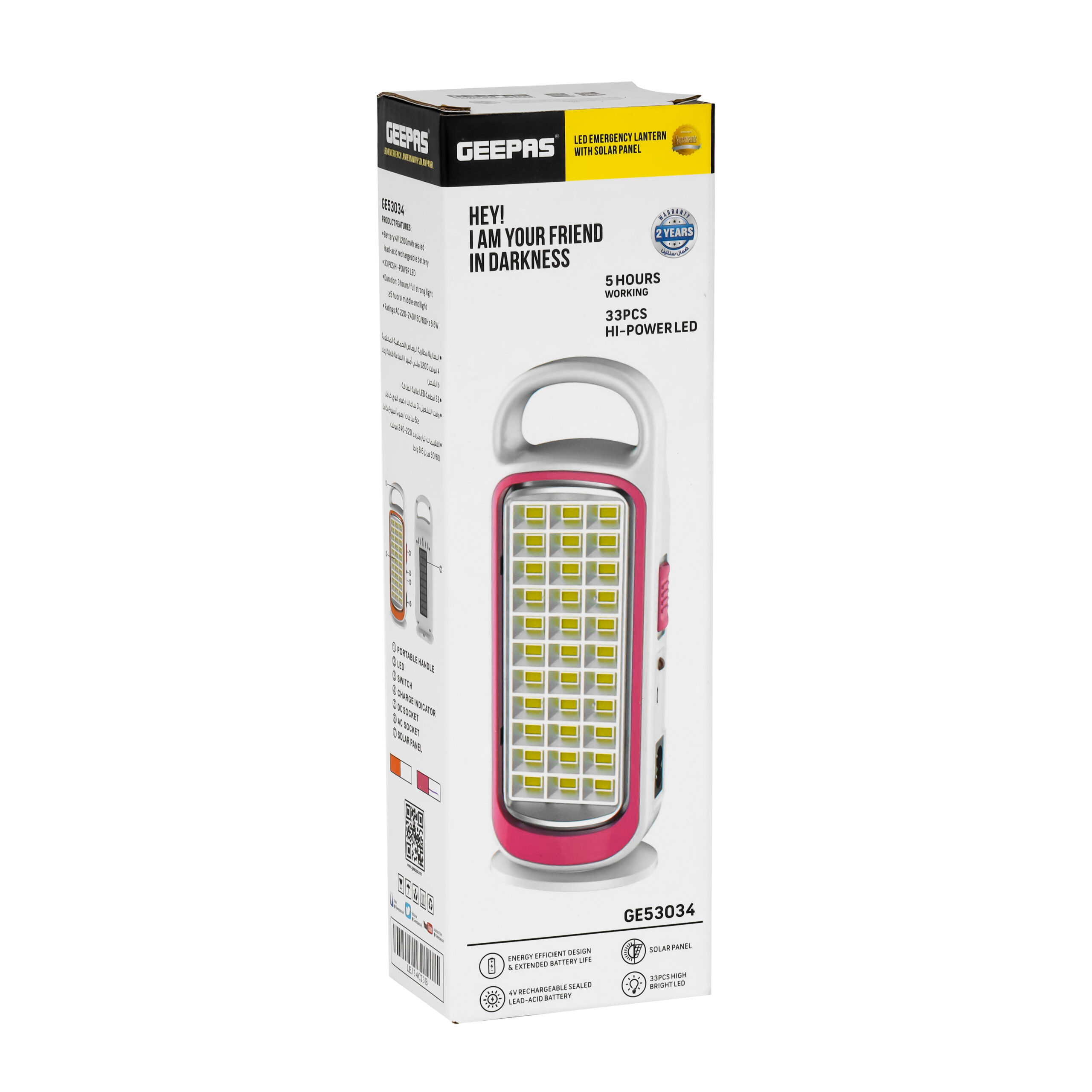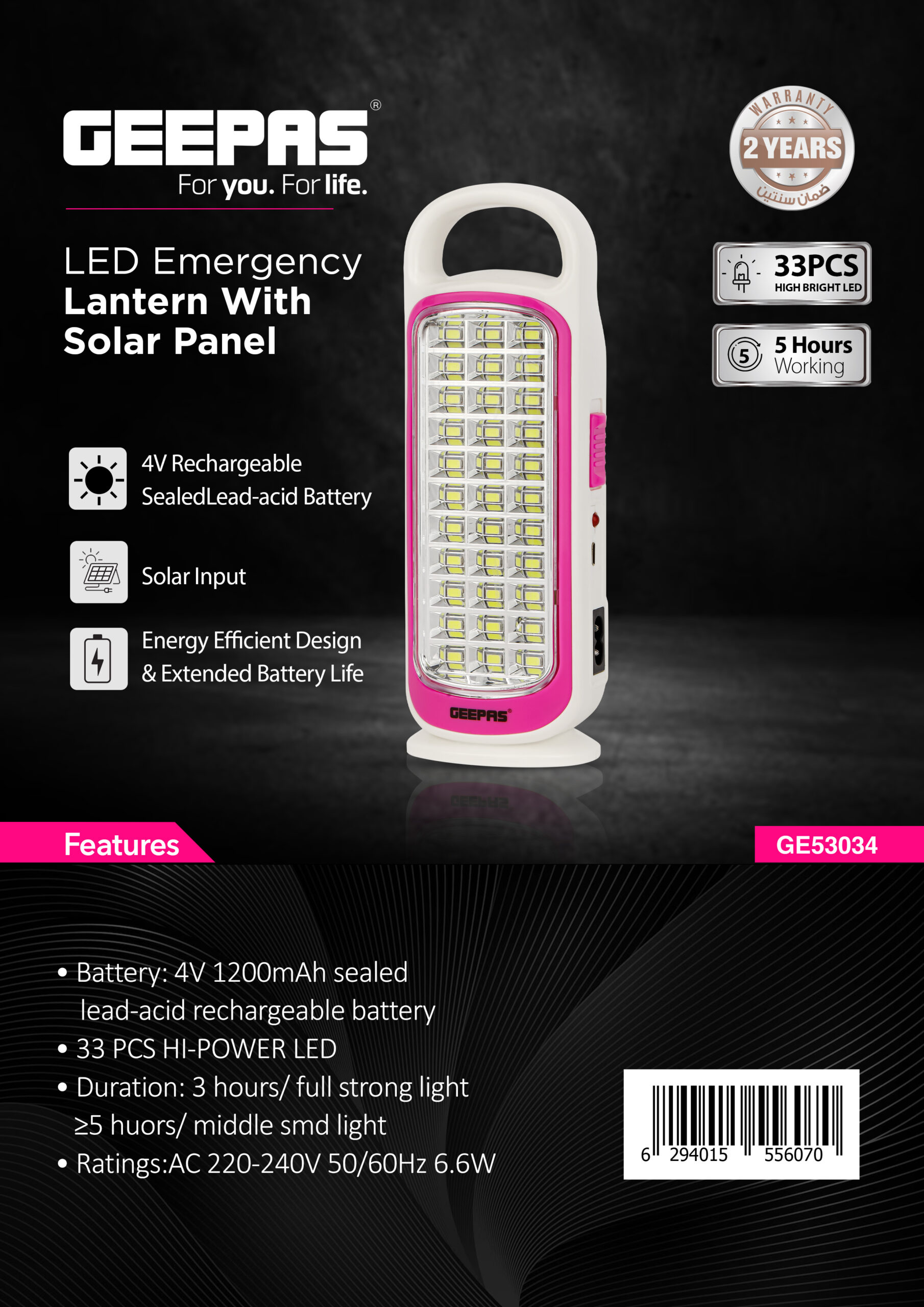 باتری سرب-اسید مهر و موم شده قابل شارژ ۴ ولتی ورودی خورشیدی طراحی کارآمد انرژی و افزایش عمر باتری ۳۳ عدد LED پرنور ۵ ساعت کارکرد|GE53034