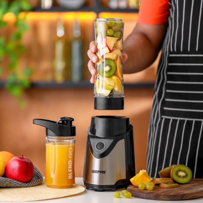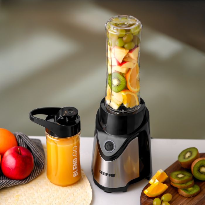 با مخلوط کن شخصی Geepas از میوه ها و سبزیجات در خانه آب میوه های خوشمزه و سالم درست کنید. مخلوط کن با دو بطری پلاستیکی ورزشی Tritan بدون BPA با ظرفیت های ۵۷۰ و ۴۰۰ میلی لیتر عرضه می شود. بطری های شفاف بسیار بادوام و مقاوم در برابر خوردگی هستند. مجهز به محفظه فولادی ضد زنگ و ظاهری براق، مخلوط کن شخصی افزودنی عالی برای آشپزخانه شما خواهد بود. تیغه های فولادی ضد زنگ با کارایی بالا حتی مواد سفت را به قوام دلخواه آسیاب می کنند و در عین حال مواد غلیظ را به راحتی برش می دهند. این مخلوط کن دارای چهار تیغه استیل ضد زنگ است و برای ساخت میلک شیک، آب میوه، اسموتی، شیک پروتئینی و غیره طراحی شده است. بدنه شفاف این امکان را به شما می دهد تا بدون باز کردن مکرر درب، فرآیند را در داخل کنترل کنید. موتور جدید و مستحکم ۵۰۰ واتی با حفاظت چندگانه، ماندگاری و کارایی بالایی دارد و امکان آسیاب مداوم حتی سخت ترین مواد را فراهم می کند. دستگیره های سبک، ارگونومیک و قوی، چسبندگی راحت و راحتی را به دست می دهد. یک مخلوط کن مشکی و نقره ای با طراحی مدرن ظاهر میز آشپزخانه شما را افزایش می دهد و همه کاره و قابل اعتماد است. مخلوط کن شخصی Geepas 1.07 کیلوگرم وزن دارد