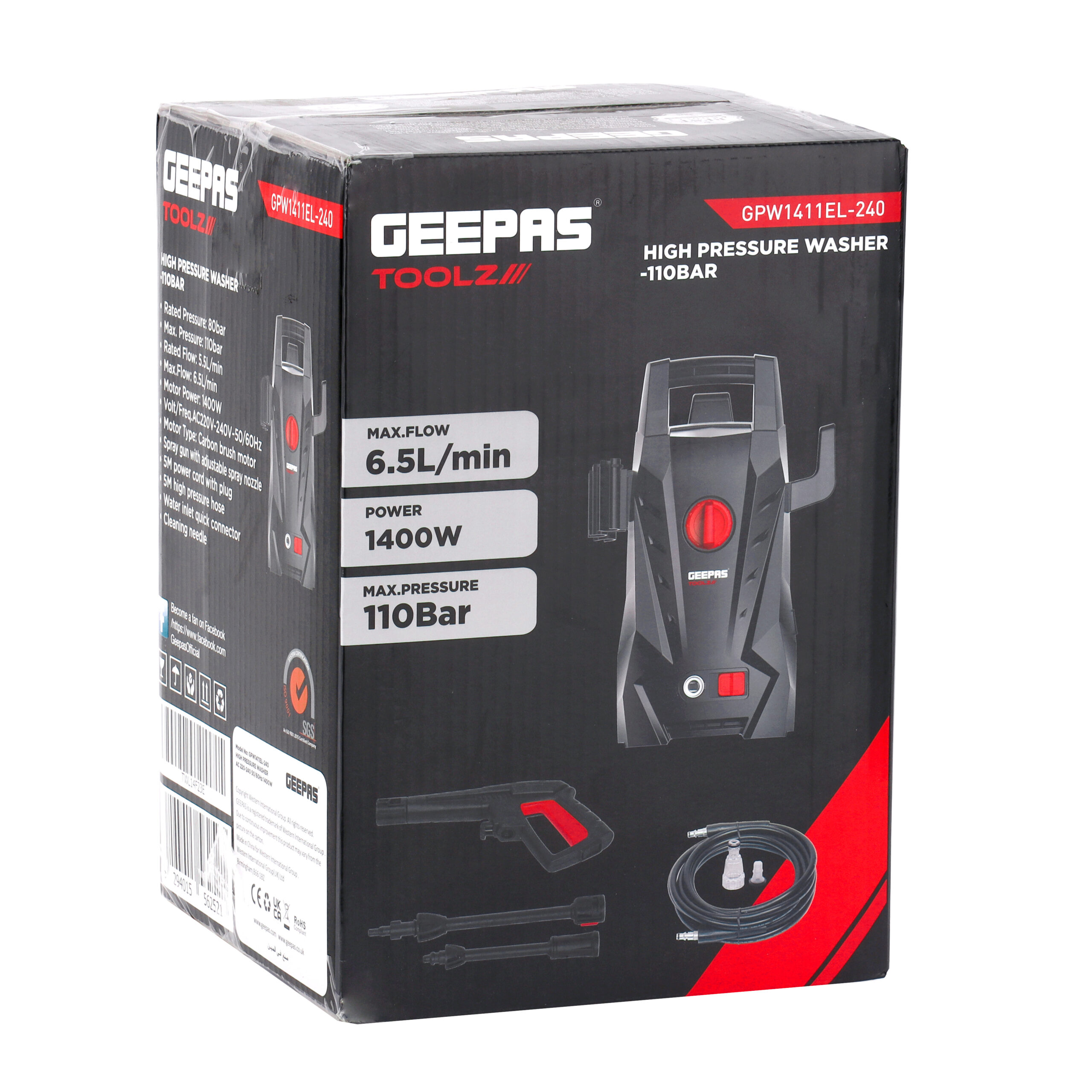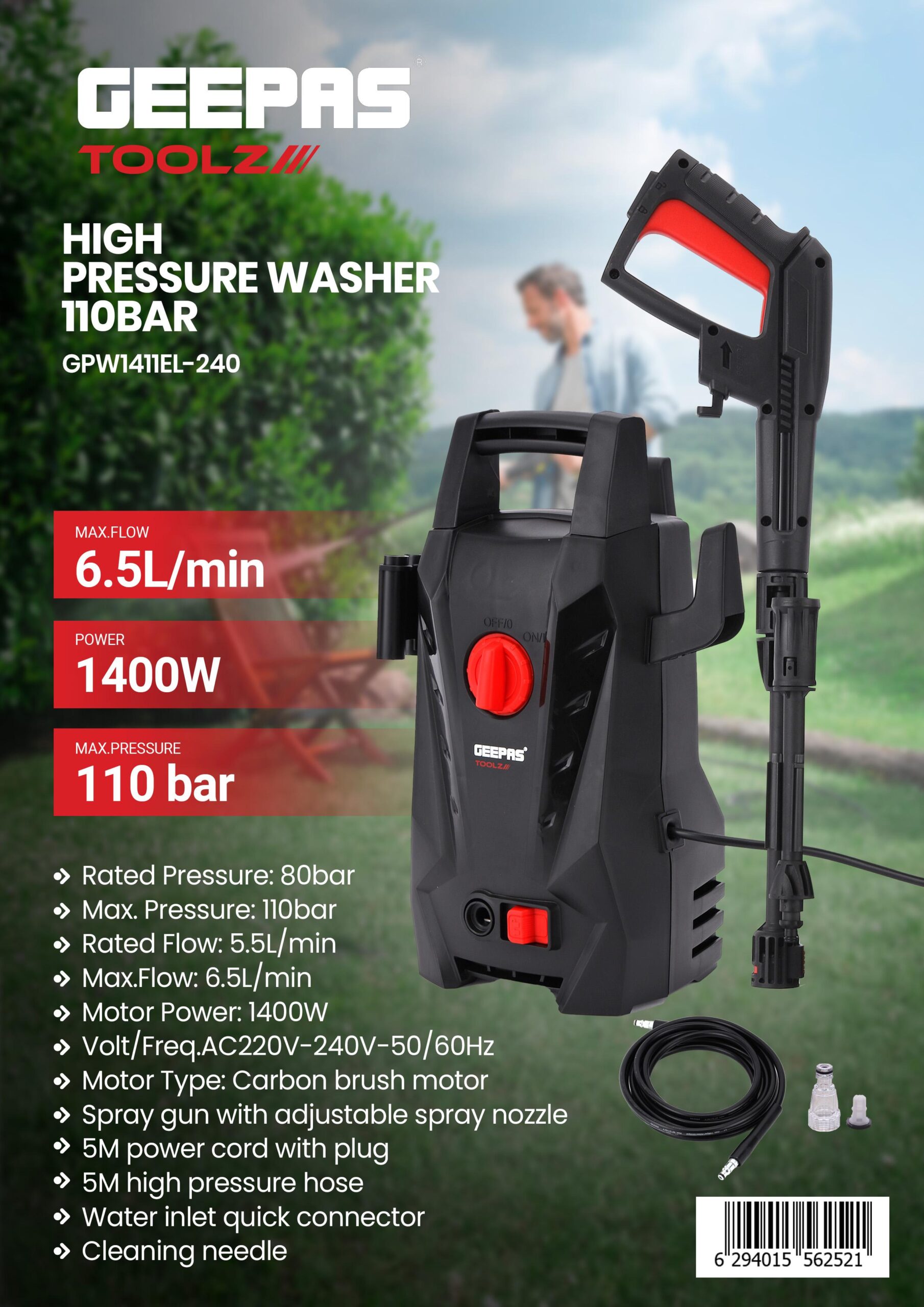 فشار نامی: ۸۰ بار حداکثر فشار: ۱۱۰ بار جریان نامی: ۵.۵ لیتر در دقیقه حداکثر جریان: ۶.۵ لیتر در دقیقه قدرت موتور: ۱۴۰۰ وات ولتاژ/فرکانس AC220V-240V-50/60Hz نوع موتور: موتور برس کربنی تفنگ اسپری با نازل اسپری قابل تنظیم سیم برق ۵ متری با دوشاخه شلنگ فشار قوی ۵ متری رابط سریع ورودی آب سوزن تمیزکننده