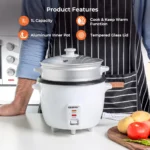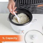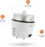 چراغ نشانگر هنگام پختن و گرم نگه داشتن دارای بدنه آلومینیومی با رنگ سفید با قاشق برنج و پیمانه اندازه گیری